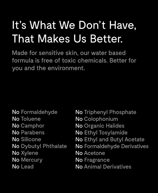 Made for sensitive skin, eyes and nose, our nail polish uses a water based formula - omitting known irritants and potentially harmful synthetics, harsh solvents, preservatives, and fragrances.